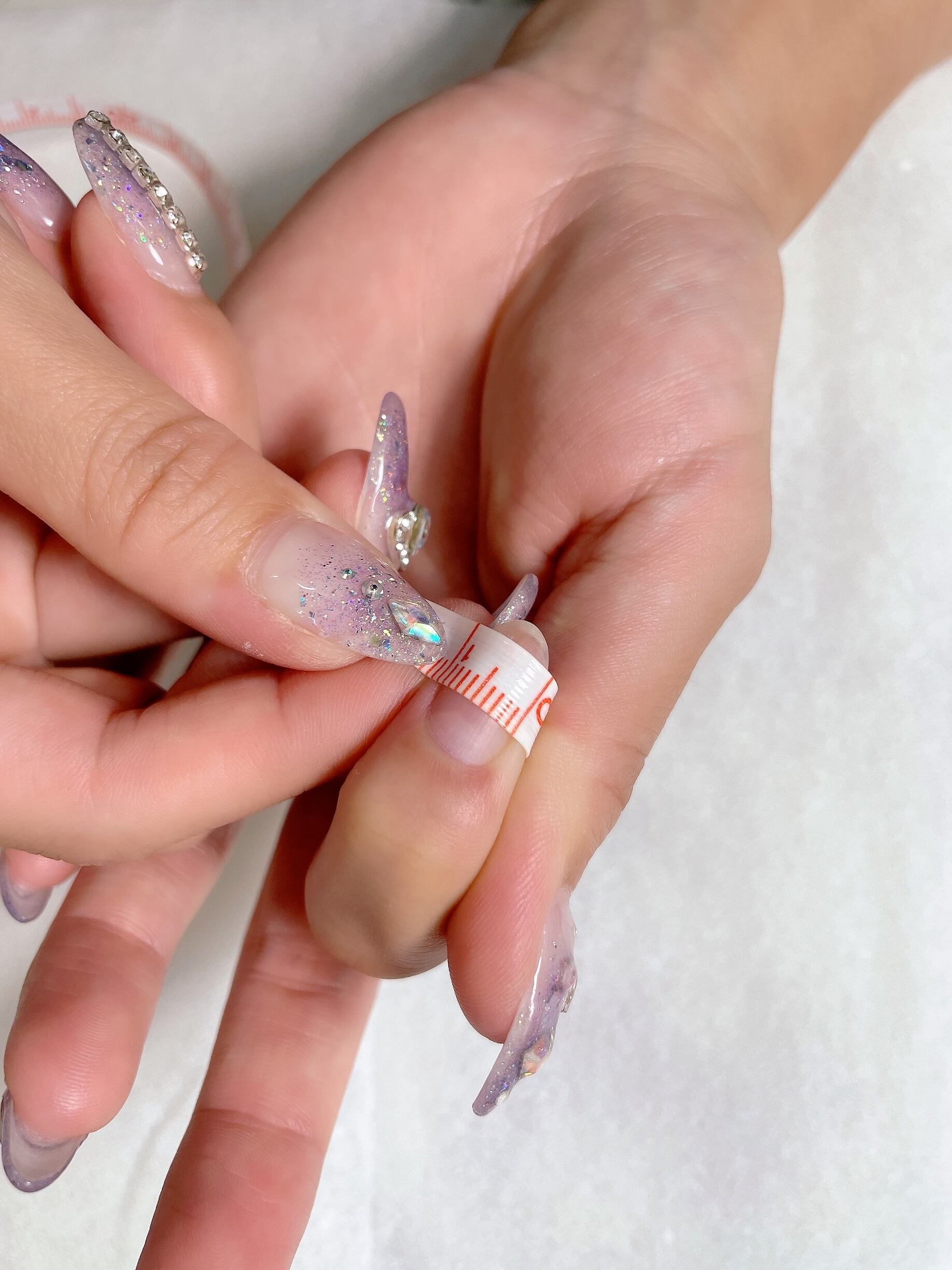 柔らかいメジャーで、自爪の端から端までのカーブ幅を測ります。
